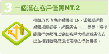 ※ 精準行銷簡訊屬特殊條件,篩選條件名單請於3個工作天前提出申請(不包含例假日)